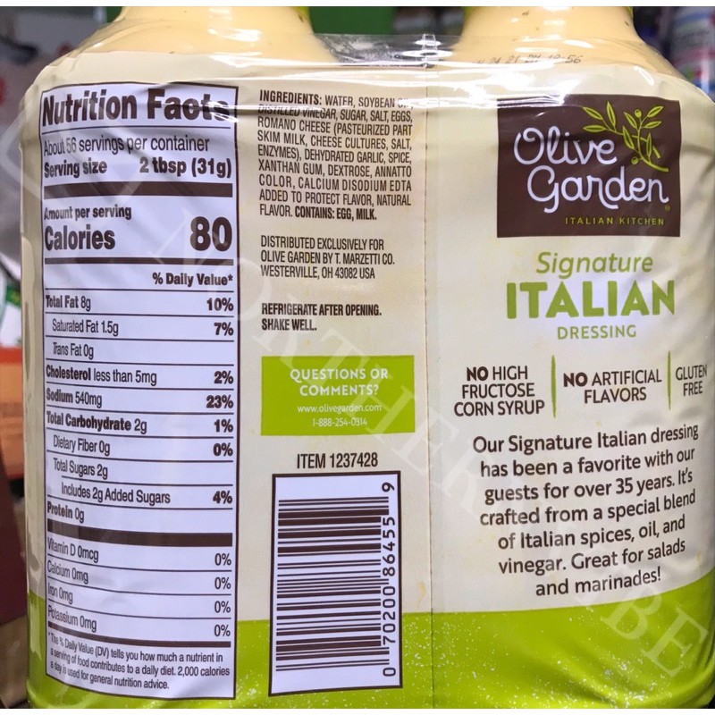 Olive Garden Signature Italian Salad Dressing - 24fl Oz : Target Read reviews and buy Olive Garden Signature Italian Salad Dressing - 24fl oz at Target. Choose from Same Day Delivery, Drive Up or Order Pickup. Free standard shipping with $35 orders. Expect More. ... Calories: 80 % Daily Value* Total Fat 8g 10%. Saturated Fat 1.5g 7%. Trans Fat 0g. Cholesterol 5mg 2%. Sodium 520mg 23%. Total Carbohydrate 2g 1 ...