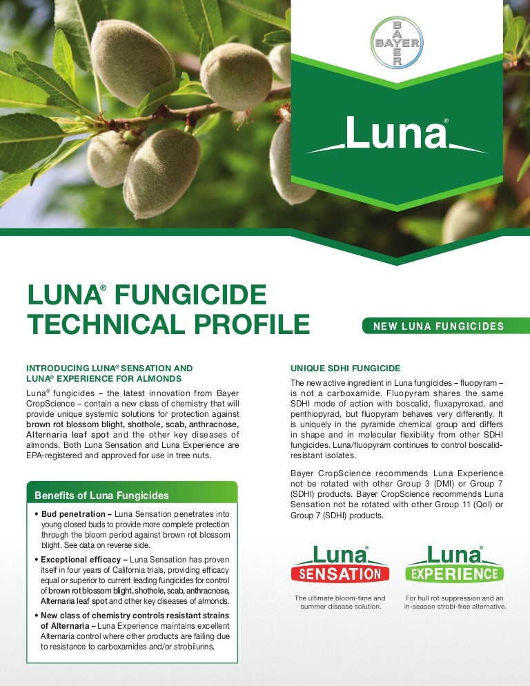 PDF US EPA, Pesticide Product Label, LUNA SENSATION, 03/14/2013 LUNA® SENSATION is a broad-spectrum fungicide with preventative, systemic, and curative properties labeled for the control or suppression of certain crop diseases. LABELED USES Almond, apple, cherry, peanut, pecan, pistachio, potato, sugarbeet, tree nuts, watermelon, and wine grapes. RESISTANCE MANAGEMENT