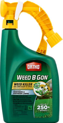 › en-us › productsOrtho® Weed B-gon™ Lawn Weed Killer Ready-To-Spray Connect the garden hose to the sprayer on the Ortho® Weed B-gon™ Lawn Weed Killer Ready-To-Spray bottle. Turn on the water. Head to the furthest point in the yard from the faucet. When you spray, work backwards toward the faucet. Slide the switch on the sprayer to "ON" to start spraying. Spray evenly across the lawn until it is wet.