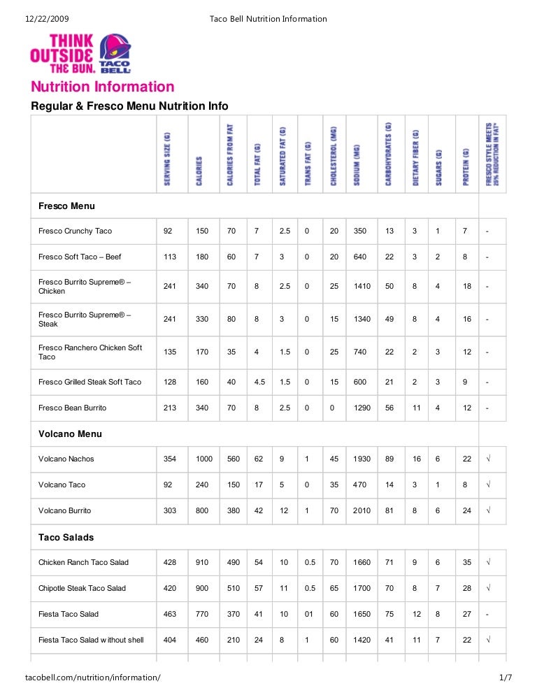 Taco Bell Nutrition Chart - Tripod Mug's Root Beer. Dr. Pepper. Lipton Iced Tea Sweetened. Coffee (Black) 2 % Milk. Chocolate Milk - 1 %. (ml) 568. 568. taco-bell.pdf Taco Bell® | Taco Bell Calories and Fast Food Nutrition Information [2/21/2012 3:34:46 PM]. Taco Bell Nutrition Facts & Calories Updated June 2022 1 taco bell nutrition; 2 taco bell calories. 2.1 burritos; 2.2 freezes; 2.3 fresco menu; 2.4 limited time offer; 2.5 power menu; 2.6 sides; 2.7 specialties; 2.8 drinks & sweets; 2.9 tacos; 2.10 cantina menu; 2.11 las vegas cantina menu; 2.12 fountain beverages(16 oz) 2.13 fountain beverages(20 oz) 2.14 fountain beverages(30 oz) 2.15 hot sauce ... Taco Bell Nutrition Facts & Calorie Information: Carbs, Fat, etc Tacos – Nutrition charts for tacos vary slightly by ingredients but generally contain between 170 and 190 calories, with 10 or so grams of fat and less than 20 ...