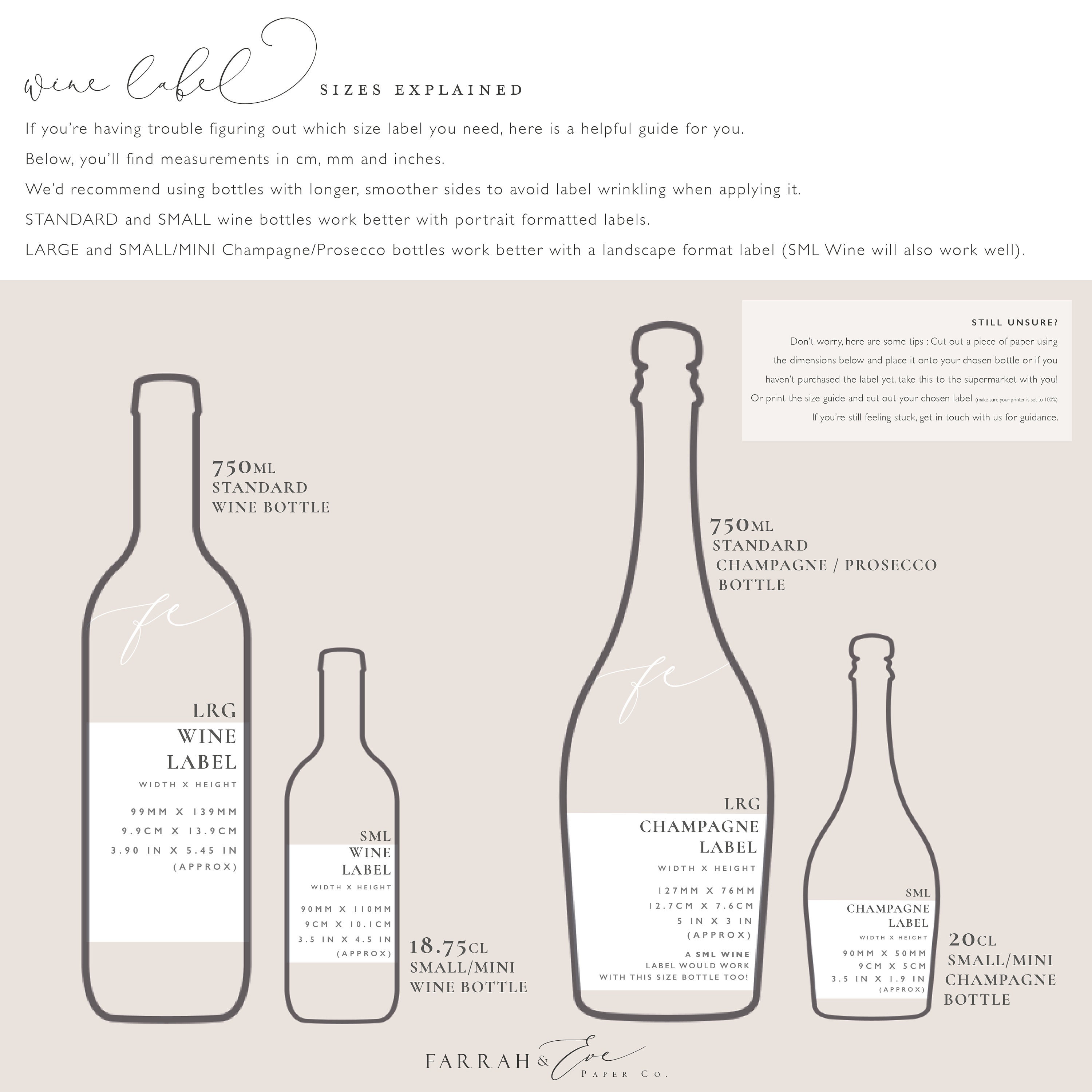 Standard Label Sizes | SheetLabels.com 32 labels per sheet 4.25" x 2.75" SL535 8 labels per sheet 8" X 1.5" SL531 6 labels per sheet 1.5" x 3.5" SL547 15 labels per sheet 4" x 3.333" VP SL104VP (vertical perf) 6 labels per sheet 3.4375" X 0.65625" File Folder SL109 30 labels per sheet 4" x 2.5" SL536 8 labels per sheet 4" X 10" SL310 2 labels per sheet 4.25" x 1.5" SL543 Average Wine Bottle Label Size - Best Pictures and Decription ... Average Wine Bottle Label Size. September 2, 2018. How many ounces are in a bottle of wine sugar and charm china size labels mall label small sizestandard teacher vine sizes methuselah vs balthazar decanter custom personalized which fits your four remendations diy to center idea land print design printrunner plete bottles anatomy mr waterproof ... Label Sizes - Canva's Design Wiki size guide Consider your objective for making a label. Afterwards, look for or come up with a design that matches your intent. Incorporate your personal preferences or brand look in your work. Get started with professionally designed label templates Wine Label 6 x 4 in Beer Label 6 x 4 in Kitchen Label 6 x 4 in Water Bottle Label 6 x 4 in Storage Label Calculate a Label Size | SizeMeUp SizeMeUp is a wine label size calculation tool that serves as a guide for wine bottling customers, design agencies and label printers. Our app features label panel dimensions for 41 of the most frequently used bottles, including burgundy, claret, riesling, sparkling and small varieties.