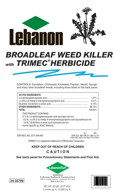 Trimec weed killer label. Gordons Trimec Classic Broadleaf Herbicide | Fast, Free ... With its proven performance on the field, the Trimec Classic is the preferred option in controlling broadleaf weeds in turf such as dandelion, plantain and others without damaging or harming other turf grass species. This product is also effective and great to use for hard to kill weeds, with no repeat application required. The Best Turf Supreme Fertilizer Settings for Spreaders Sep 21, 2017 · Turf Supreme 16-6-8 with Trimec contains 16 percent combined sulfur, 1.5 percent iron and 0.2 percent manganese, along with weed killer. BEST Turf Gold is a mixture of BEST Turf Supreme and X-Cote polymer- and sulfur-coated urea; apply with any spreader, except for drop-type spreaders. Trimec ES8000 V-lock | ASSA ABLOY Trimec ES8000 V-lock. The ES8000, also known as the V-lock is a high torque motorised bolt that moves from the vertical position to the horizontal state when locked. Side load - pre load capable lock will unlock with up to 15kg of side pressure, when wired in 3 wire mode. 1 x permanent power (positive 1224Vdc) wire. Is trimec harmful to humans? – Farfromhomemovie.com Trimec can be applied any time weeds are visible in your yard and temperatures are 65–85℉ (18–29℃). Apply Trimec at least 24 hours before rain or lawn watering. This allows time for the herbicide to dry and fully infiltrate the plant system. How often can I spray trimec? How much water does it take to apply trimec 992?