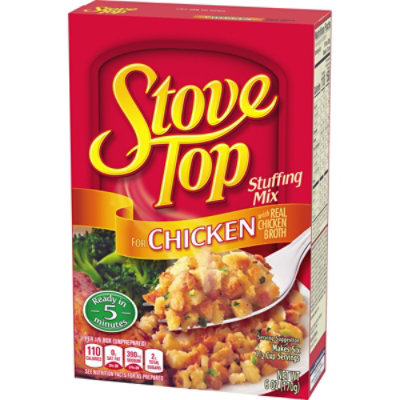 Calories in Stove Top Chicken or Turkey Stuffing Mix, dry | CalorieKing There are 108 calories in 1 serving, 1/6 box (1 oz) of Stove Top Chicken or Turkey Stuffing Mix, dry. You'd need to walk 30 minutes to burn 108 calories. Stove Top Pork Stuffing Mix - Shop Pantry Meals at H-E-B Nutrition Facts · Amount Per Serving. Calories. 150 · % Daily Value · Total Fat. 5g; 7% · Saturated Fat. 1.5g; 8% · Trans Fat. 0g · Cholesterol. 0mg; 0% · Sodium. Find Stove Top Stuffing Calories & Nutrition Facts | MyFitnessPal Search MyFitnessPal for calories, carbs, and nutritional contents for Stove Top Stuffing and over 2000000 other foods at MyFitnessPal.