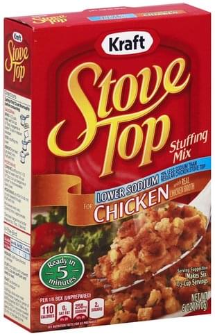 Stovetop stuffing nutrition. Carbs in KRAFT, STOVE TOP Stuffing Mix Chicken Flavor KRAFT, STOVE TOP Stuffing Mix Chicken Flavor (1 NLEA serving, (makes 1/2 cup prepared)) contains 20.5g total carbs, 19.8g net carbs, 1.1g fat, 3.5g protein, ... Stove Top Stuffing Mix for Chicken: Calories, Nutrition Analysis & More Personalized health review for Stove Top Stuffing Mix for Chicken: 120 calories, nutrition grade (C minus), problematic ingredients, and more. Learn the good & ... Calories in Stove Top Stuffing Mix for Chicken from Kraft - Nutritionix Nov 25, 2022 ... Stove Top Stuffing Mix for Chicken · Serving Size: box (28g grams) · Calories 110. Calories from Fat 10 · 2%. Vitamin A · 2%. Vitamin C · 0%. Calcium. Stove Top Lower Sodium Chicken Stuffing Mix - H-E-B Sodium 220mg, 10% ; Potassium 0mg, 0% ; Total Carbohydrate 21g, 8% ; Dietary Fiber <1g, 3% ...