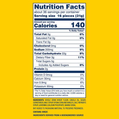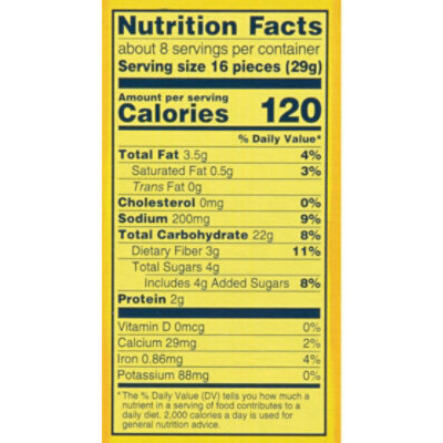 Wheat Thins Crackers, Reduced Fat - Fooducate Wheat Thins Crackers, Reduced Fat nutrition grade B plus 120 Calories Per Serving 71 comments Rating: 4.38 with 1335 ratings 71 followers Explanations Keto: net carbs 19g If you are following a ketogenic diet (keto), you need to restrict your daily carbohydrate intake so that your body enters ketosis. Reduced Fat Wheat Thins Nutrition Facts - Eat This Much For a Serving Size of 1 serving ( 29 g) How many calories are in Reduced Fat Wheat Thins? Amount of calories in Reduced Fat Wheat Thins: Calories 130. Calories from Fat 31.5 ( 24.2 %) % Daily Value *. How much fat is in Reduced Fat Wheat Thins? Savoritz Thin wheat Crackers, Reduced Fat - Fooducate For women: 100 calories (25 grams, 6 tsp per day) For men: 150 calories (37 grams, 9 tsp per day) The FDA is more "generous", the Daily Value for added sugars is 200 calories (50 grams, 12 tsp per day). Here at Fooducate, we suggest sticking to the stricter option (only 25 grams per day for women, 37 grams for men). More info. Nice! 100% whole ... Wheat Thins Reduced Fat Nutrition Facts - Eat This Much How many calories are in Wheat Thins Reduced Fat? Amount of calories in Wheat Thins Reduced Fat: Calories 120. Calories from Fat 31.5 ( 26.2 %) % Daily Value *. How much fat is in Wheat Thins Reduced Fat? Amount of fat in Wheat Thins Reduced Fat: Total Fat 3.5g. -.