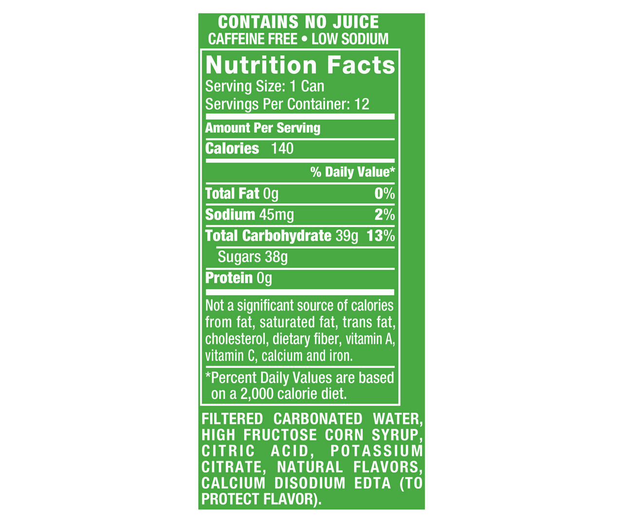 7up nutrition label. Calories in 7Up - 1 can from Nutritionix 7Up - 1 can ; Calories 151 ; % Daily Value* ; Total Fat 0g grams 0% Daily Value ; Saturated Fat 0g grams 0% Daily Value ; Polyunsaturated Fat 0g grams. Nutritional Information, Diet Info and Calories in Seven Up from 7-UP Nutritional Information, Diet Info and Calories in. Seven Up from 7-UP ; Vitamin A 0% · Vitamin C 0% ; Calcium 0% · Iron 0% ... 7 Up 330Ml Can - Tesco Groceries Per 330ml: ; Energy: 271kJ · 3% ; Fat: 0g · 0% ; Saturates: 0g · 0% ; Sugars: 16g · 17% ; Salt: 0.13g · 2% ... 7up.com - Original 7UP Refresh yourself with an Original 7UP® with 100% natural flavors and its iconic lemon lime flavor! Nutrition Facts. Calories. 140. Serving Size. 12.00 fl oz ...